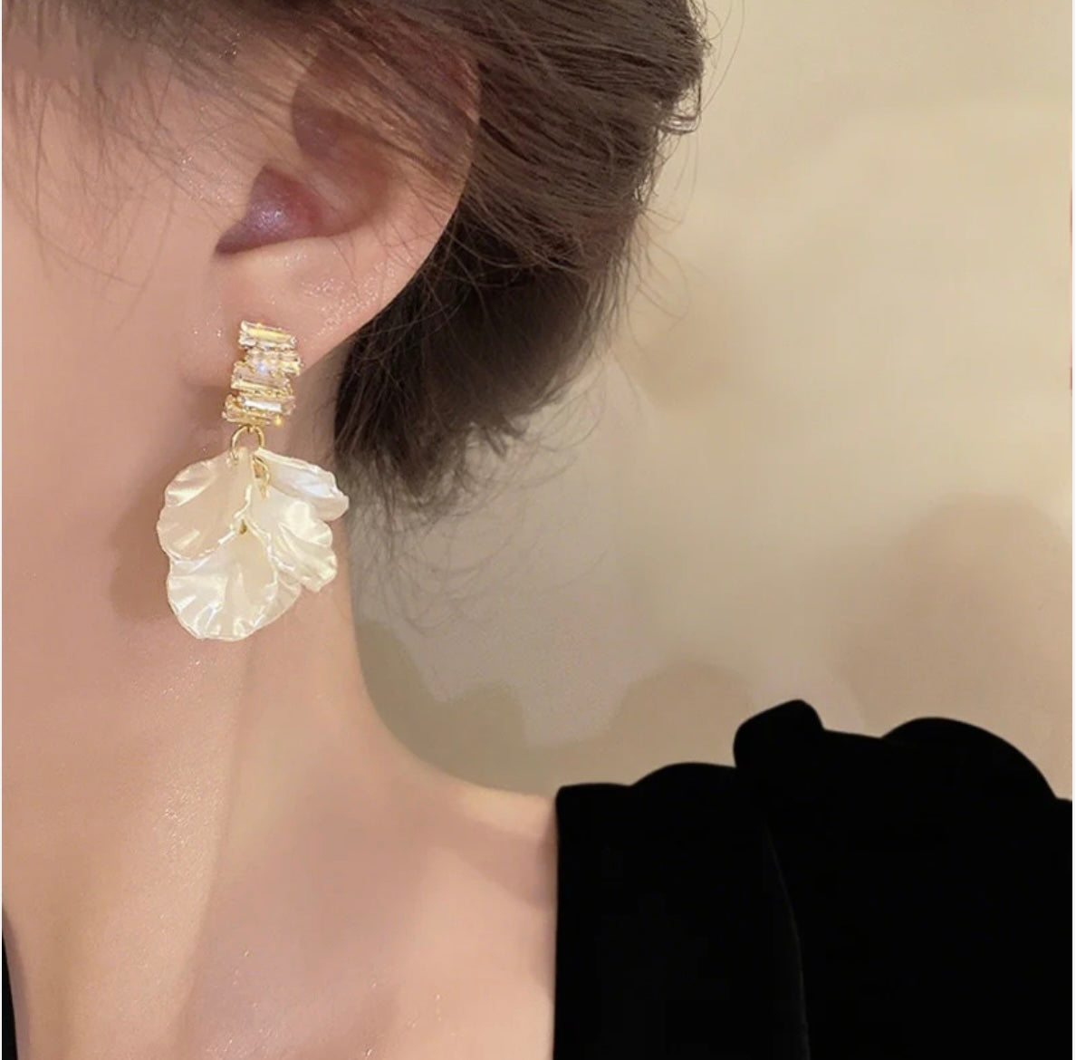 These luxury floral statement earrings feature delicate layered petals in a pearly white finish, paired with a sparkling baguette crystal top. The design is elegant yet modern, making them perfect for weddings, festive occasions, and high-fashion looks. πΈπ€β¨